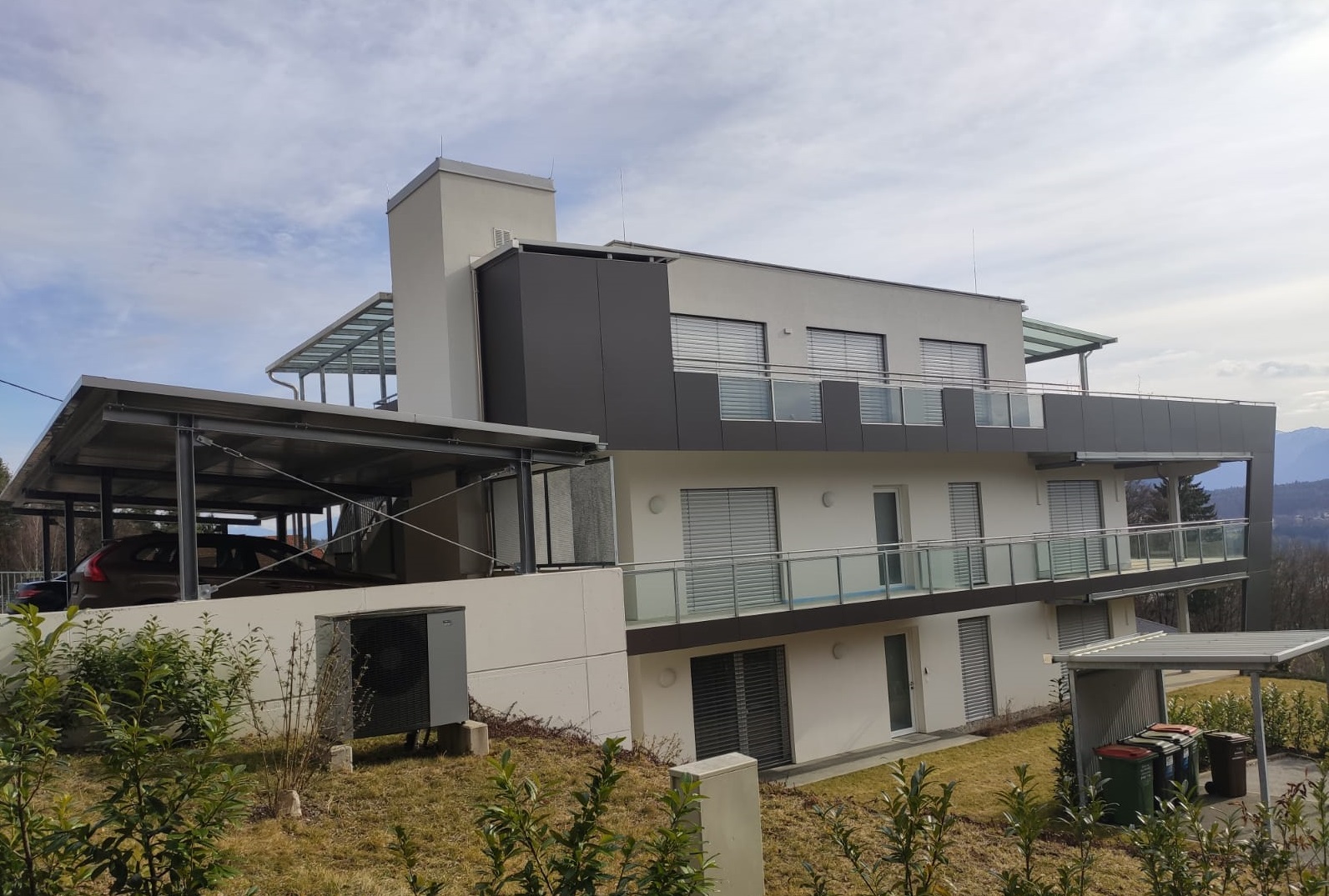 Il corpo a tre piani verrà prolungato esternamente con un pergolato aperto sviluppato nella parte sud, su una grande terrazza ed un balcone . Una torre per l’ascensore collegherà tutti i piani.